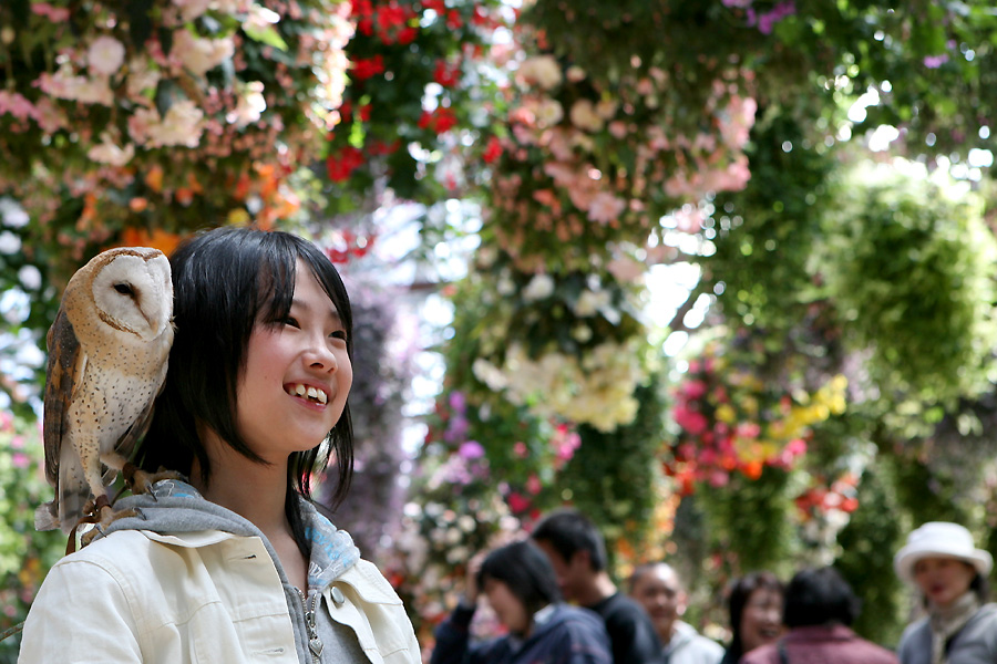 | You can take a souvenir picture with an owl in charge of the Owls Show. You can perch it on your arm or shoulder, you can touch it. The owl in this picture is Jaspers the Barn Owl, the most popular owl in the Garden that loves to be touched very much. | ||||||