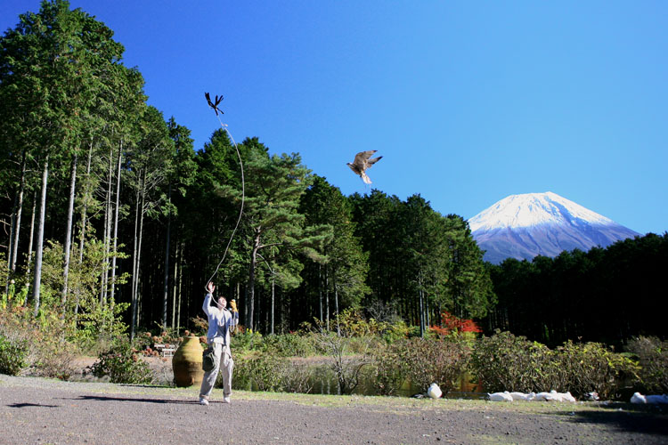 | 花の温室を出てから林縁に沿って歩くと、今度はタカとハヤブサが主役のショー会場に到着します。 富士山をバックに繰り広げられる軽快なショーをご覧ください。 ☆ 開催時間は13:30 天候によっては、屋内会場に変更となります。 |