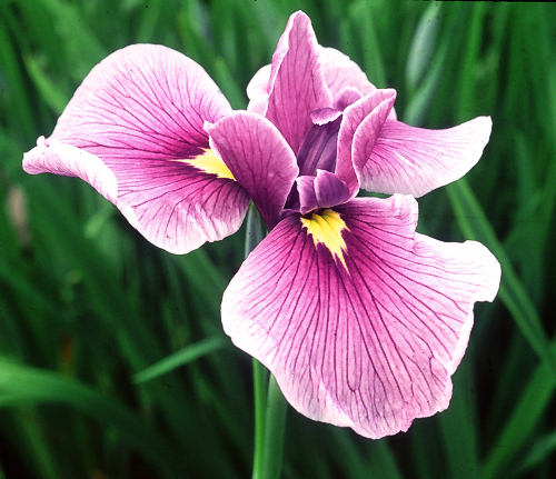 朝の光 あさのひかり ASA NO HIKARI 江戸系 早生 底紅大ぼかしに紅細脈の三英咲き、花径はおよそ13cm程度の中輪。 遠くから目立つ色彩で、草丈も100cm以上に伸びる。 1985年、加茂花菖蒲園作