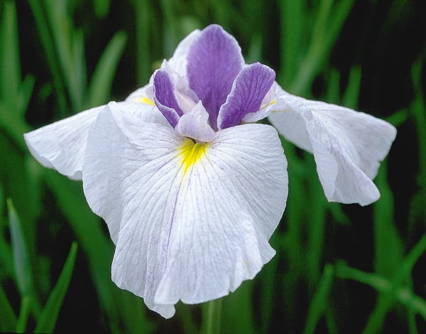 江戸系 早中 白地に薄紫の砂子がわずかに入り、鉾は紫に白覆輪の入る二色花。