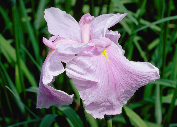 安濃の乙女 あのうのおとめ ANO NO OTOME 伊勢系 早生 薄桃に紅の細脈、伊勢系らしいおだやかな色彩の三英垂れ咲き。 花径はおよそ13cm程度の中輪 1958年、伊勢花菖蒲園の前田七郎氏作出