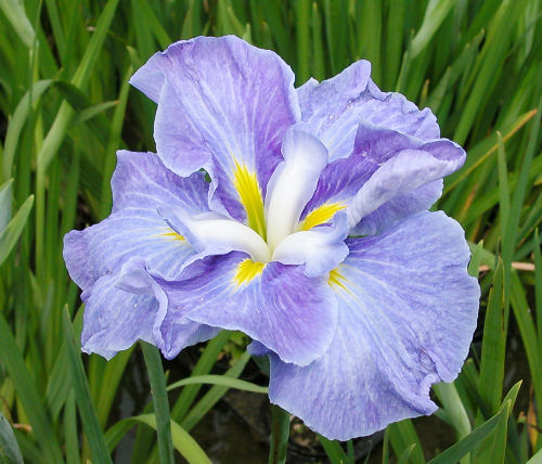 青 根 あおね AONE 江戸系 明るい藤青色に淡い白筋が入る六英平咲き。花の直径は15cm程度、草丈は80cm程度 清水弘氏の作花