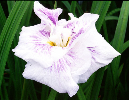 朝日の雪 あさひのゆき ASAHI NO YUKI 肥後系 白地に弁元紅色の絣が少々入る八重 1953年以前に平尾秀一氏が作出した、氏の作花の中でも古い品種