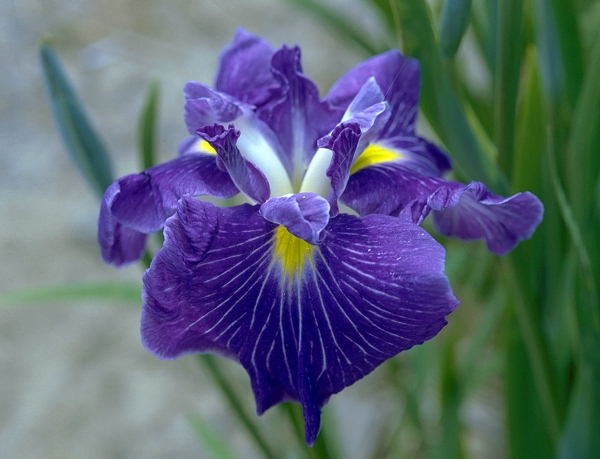 平尾秀一氏の作花。「朝戸開」という名前は、1969年に平尾先生と当園主の加茂が、千葉県の牧野善作氏の所に泊まり、朝一番に戸を開けて花菖蒲の圃場を見たとき、一輪の花がまさに咲き始めており、その鮮明なブルーがパッと眼に飛び込んで来たからだという。その花に「朝戸開」と付け、その類似花に「新朝戸開」と命名した。「青岳城」もこのときの選抜である。