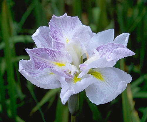 さわらび SAWARABI 江戸系 白地に紅紫のかすりが少々入る平咲きの半八重。花径12cm程度。 写真はひらきはじめだが、開き切ると平開咲きになる。