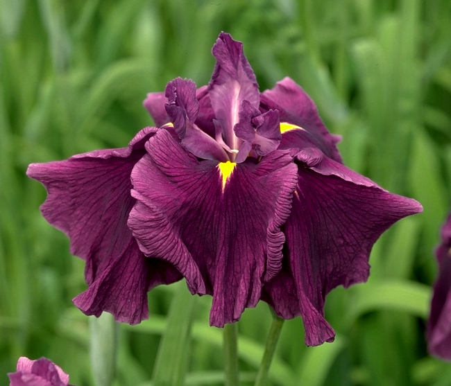肥後系 中晩生 濃いビロード紅紫の六英花。花径は約20cmほど、良く出来ると25cmを超え、花菖蒲