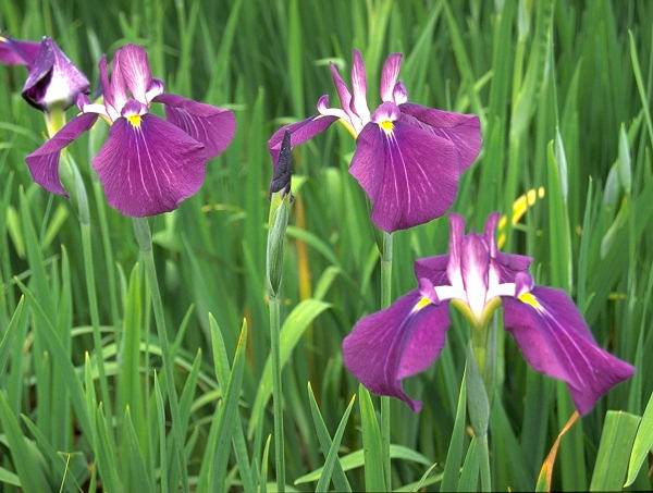 紅且美 べにかつに BENI KATSUMI 長井系 中生 濃い紅紫の三英花。花径はおよそ10cm程度の小輪。 草丈は100cm程度。性質は丈夫で繁殖も良い。 長井古種系で当園が1989年に作出した品種。芯が白くコントラストが美しい。