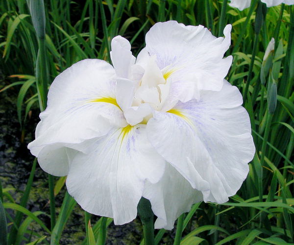 肥後系 純白地に弁元に水色のかすりが入る八重咲き。花径はおよそ18cmを超える極大輪。