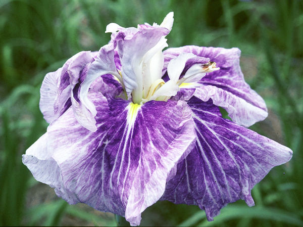 肥後系 白地に弁元藤色で白筋の入る六英から半八重。花径はおよそ15cmほどの中輪。