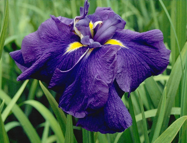 肥後系 明るい紺紫で芯が崩れる六英花。花径はおよそ18cm程度の大輪。
