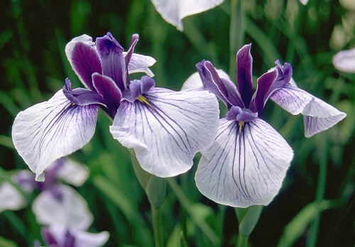 長井系 白地に濃紫の脈が入り、芯は紫、鉾は紅がかる紫となる平咲きの三英花。