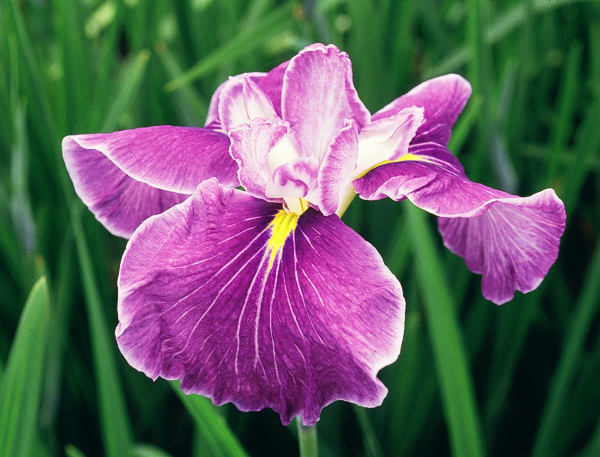 出羽の曙 でわのあけぼの DEWA NO AKEBONO 江戸系 中生 紅色に白筋と白覆輪ぼかしが入る三英花。花径はおよそ15cm程度の中輪。 草丈は100cm前後。性質、繁殖は普通。 戦前に長井のあやめ公園で選抜された品種と聞く。その頃はまだ長井古種は存在はしたが認知されて おらず、昔から長井にあったあやめというほどのものであった。この品種は、東京の堀切などから江戸花 菖蒲をあやめ公園に取り寄せ、それらの実生から選抜したもの。
