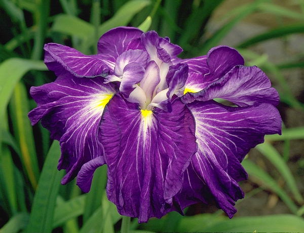 肥後系 晩生 濃い紫に白筋が鮮明に流れる六英花。花径はおよそ18cmを越す大輪から極大輪。