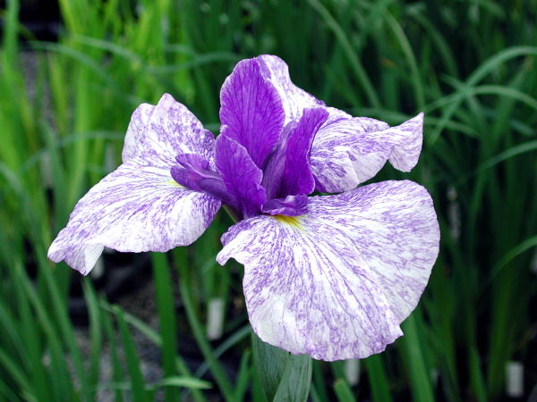 江戸系 中生 白地に青味の紫絞りが入る平咲きの三英花。鉾は青みの紫。