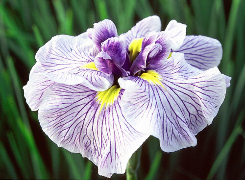 エンボスド ENBOSSED 米国種 白地に鮮明な紫脈が入る中大輪。直径は16cmほど。 「神代の昔」に似るがこちらの方が大輪