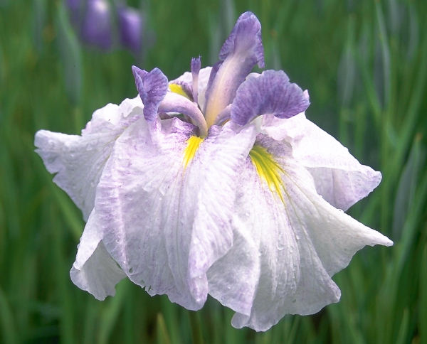 煙樹ケ浜 えんじゅがはま ENJYU GA HAMA 肥後系 中生 白地に弁元藤紫の砂子ぼかし、鉾藤紫砂子の六英花。花径はおよそ18cm程度の大輪。 草丈は70cm程度。性質、繁殖は普通。 光田義男氏が、1968年に作出した品種。性質が丈夫なので、当園で昔から卸出荷していたので、こんにちでは かなり普及していると思う。「月の浜辺」に雰囲気が似ている。