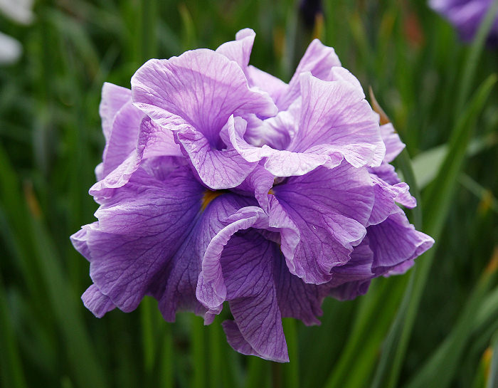 藤の襲 ふじのかさね FUJI NO KASANE 江戸系 ややくすんだ藤色に紫の脈が入る八重。花径はおよそ13cm前後の中輪。 草丈は60cm前後。性質、繁殖は普通。 伊勢系の血の入った品種で、弁質は縮緬地で伊勢系の特徴が出ている。「宝 玉」などに 花色は近くやや濃色。 弁質は「黒竜獅子」のようなやや詰まった堅い感じで、優雅に伸び 広がる感じではない。 2003年、加茂花菖蒲園作