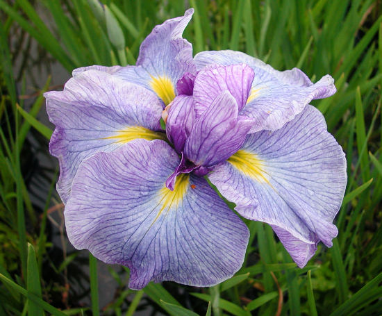 藤勝見 ふじかつみ FUJI KATSUMI 江戸系 中晩生 微妙な色彩の藤色地に濃色の脈が入る五英花。 芯は弁化し、台咲きになりかてている。 江戸古花の「八重勝見」の後代で、雰囲気は似ている。五弁でしかも台咲きという 変わり咲きの品種。 2003年加茂花菖蒲園作