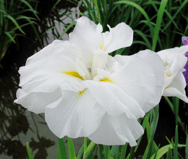 江戸系 中生 純白の受け咲き八重。花径は15cm以上になる大輪。