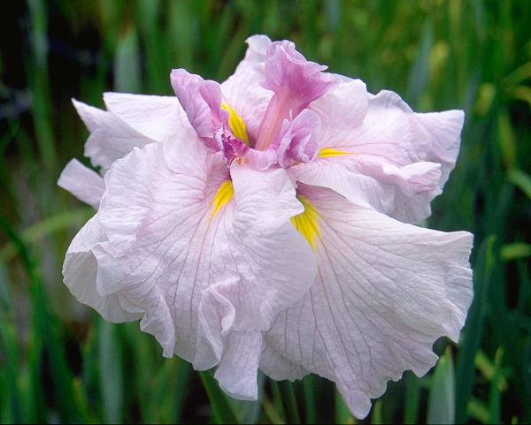 迎春花 げいしゅんか GEISYUNKA 肥後系 中生 白地にピンクの小筋が入り芯が濃いピンクに染まる六英花。花の直径は20cm を越す極大輪で、花弁が波打ちたいへん豪華な花。性質はやや弱く鉢で丹精するのに向く。 1979年 光田義男氏の作