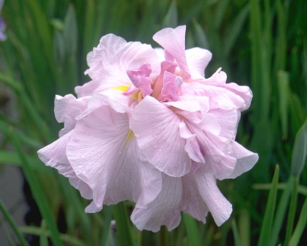 祇女桜 ぎじょざくら GIJHOZAKURA 肥後系 中生 ピンクの八重。花径は16cm程度になる。草丈は約80cm。 く花弁が大きく波打ち、中心の芯が紅に染まりたいへん美しい花。光田氏らしい 作品と言える。性質はやや弱く、鉢植えで丹精して、咲いたら室内観賞すると良い。 1981年〜83年頃の作出