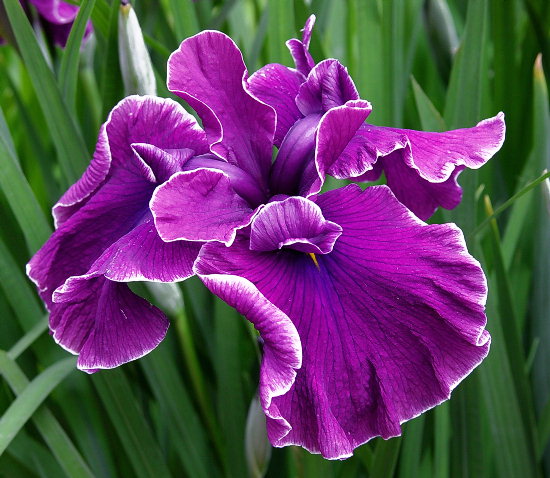 銀の華 ぎんのはな GIN-NO-HANA 江戸系 紅がかる濃紫に鮮明な白糸覆輪の三英花。花径はおよそ16cm前後。 草丈は約60cm前後とやや低い。性質、繁殖は普通。 紫に白糸覆輪系では久々の新花。リゾクトニア性の立ち枯れ病にも割と強く、そういった意味で は栽培しやすい。2003年 加茂花菖蒲園 作