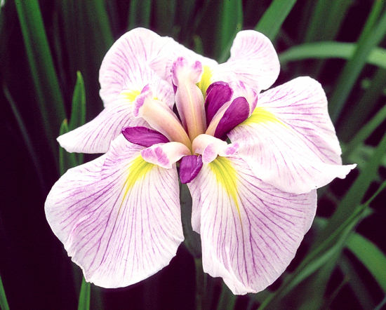 五三拍子 ごさんびょうし GOSAN BYOHSHI 江戸系 中生 三、四、五、六英に咲き分ける二色花。花径はおよそ10cm程度の中小輪。 草丈は50cm内外。性質、繁殖は普通。 加茂花菖蒲園で19952年に作出された品種。江戸古花の「五三の宝」の後代。