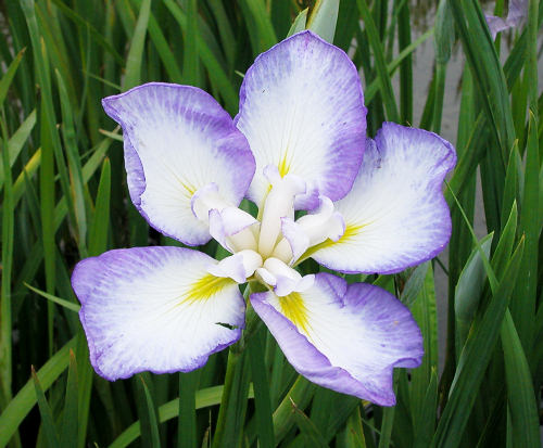 五三の空 ごさんのそら GOSAN NO SORA 江戸系 白地に弁の淵にかけて青色がぼかす五英咲き。花の直径は10cm程度の小輪、 草丈は50cm程度。花弁の数が5枚のかわいらしい変わり花。 2002年 加茂花菖蒲園作
