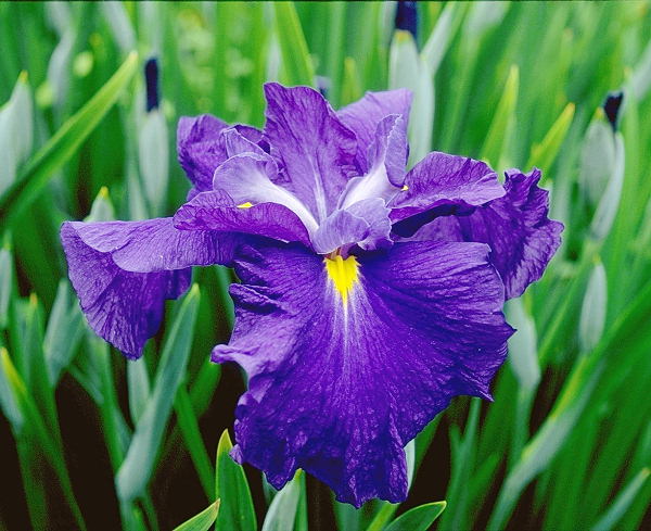 江戸系 中晩生 ルリ紺色の三英花。花径はおよそ13cm程度の小輪.