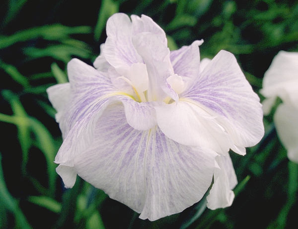 肥後系 晩生 白地に明るい藤色のぼかしと白筋の入る八重。花径はおよそ18cm程度の大輪。