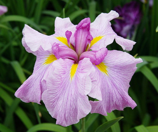 花散里 はなちるさと HANA CHIRU SATO 江戸系 ピンクの絞りの六英花、鉾は濃ピンク。花径はおよそ16cmほどの中輪。 美しい明るいピンクの花を付けるが、葉が極端な垂れ葉で、草も花も全体になよなよと した感じを受ける。草丈は60cm程度。 2002年、加茂花菖蒲園作