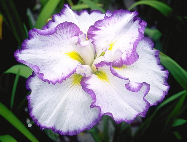 花 寿 はなことぶき HANA KOTOBUKI 江戸系 中晩生 白地に鮮明な紫の覆輪が入る六英花。花径は約15cm程度の中大輪。 花弁は垂れず平咲きに咲く。鮮明な色彩で美しい花だが、やや性質が弱い。草丈は高めで100cm を越す。1992年、加茂花菖蒲園作。