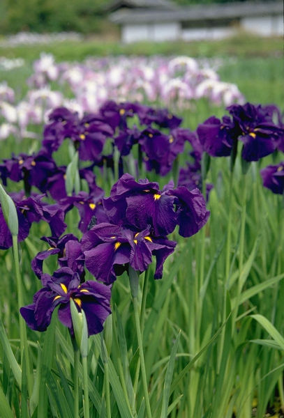 江戸系 極早生 艶のある濃紫の六英平咲き。花径はおよそ13cm程度の中輪。草丈は低く出来ても60cm程度。性質は普通。繁殖は良い。