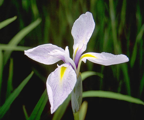 一 迫 いちはさま ICHI HASAMA 原種系 白地に藤色の細かな絞りが入る三英。芯の元が青紫に染まる。直径は10cm程度の小輪。 宮城県一迫町の山王菖蒲園の代表品種で、長井古種から選抜されたという。実生すると、この花に近い 花形、花色の花が咲くが、四弁の白花なども出てくる。