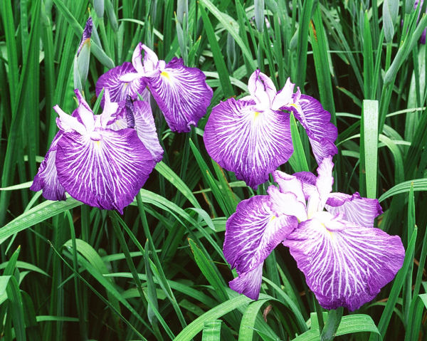 妹背契 いもせちぎり IMOSE CHIGIRI 肥後系 中生 青味を含む明るい紫に白筋が入る三英花。垂れ咲き。 花径はおよそ16cmほどの中輪。草丈は80cm前後。性質、繁殖は普通。 日本花菖蒲協会に在籍した中村元義氏の作。作出年代は不明だが、昭和30年〜40年 頃のものと考えられる。肥後系とするには芯も小さく、少し花にしまりがない感じがする。