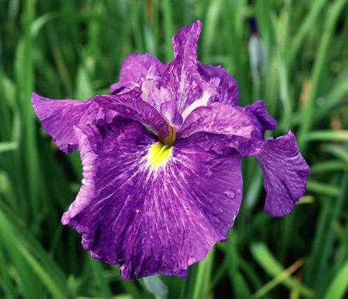 江戸系 紫地に白の吹きかけが荒く入る三英中輪、草丈は高い