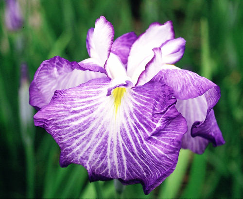 伊勢系 紫に白筋の入る花径14cmほどの三英中輪