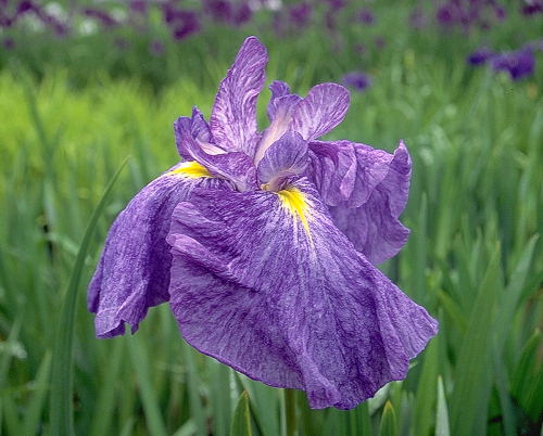 伊勢海 いせのうみ ISE NO UMI 伊勢系 藤紫色に濃藤紫の絞りと白色の脈が入る垂れ咲きの三英。花径はおよそ13cm前後の中輪。 葉は堅そうな濃緑の剣葉で、草丈は60cm前後、性質、繁殖は普通。 伊勢花菖蒲の古花の一つ。古くから松阪地方で栽培されてきた品種。花弁は縮緬地が発達し、 伊勢系の特徴をよく備えている。1920年以前。 伊勢花菖蒲の古花は、三重県松阪市の松阪三珍花会で保存されている。