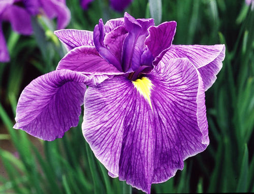 江戸系 薄紫に濃い紫の脈、鉾は紫、三英中大輪、草丈高くおおらかな花
