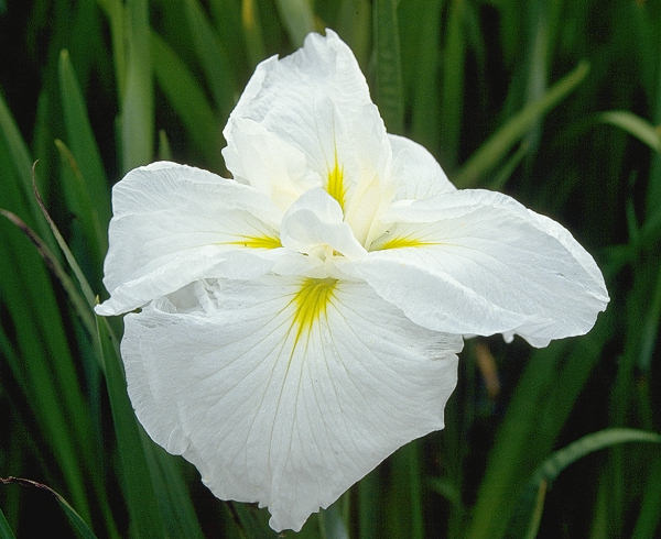 磯打波 いそうつなみ ISOUTSUNAMI 熊本花菖蒲 雪白働花六英花。花径はおよそ18cm程度の大輪、 明治時代に熊本の林猪三郎氏によって作出された熊本花菖蒲の古花。 熊本での名称は「荒瀬の波」で、こちらの方が本名だが、横浜の西田衆芳園が昭和初期頃 「磯打波」と改名して販売した。