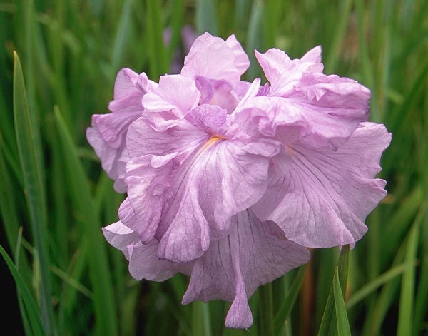 九重の桜 ここのえのさくら KOKONOE NO SAKURA 肥後系 くすんだピンクの八重咲き。花径は16cmほどの中輪から大輪。 昭和40年代の作花で、当時としては、このくすんだ色彩もこれで良かったのだろうと思うが、 今になって見ると灰色がかる色彩で、ピンクかどうか微妙な花である。 1967年、光田義男氏の作。