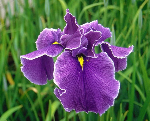 神 曲 しんきょく SHIN KHOKU 江戸系 中生 紫に白の糸覆輪の入る三英。花径は約15cm程度の中輪だが、 花弁が垂れるので、広げて見ると大きな花である。 1990年代になって、当園で紫に糸覆輪の入る系統の品種が多数作出された。これらは、 今までにない色彩でたいへん人気が高かったが、1997年頃からリゾクトニア性の立ち枯れ病 が花菖蒲に現れ、とくにこの系統はこの病気に弱く、栽培がたいへん難しくなった。 1993年、加茂花菖蒲園作