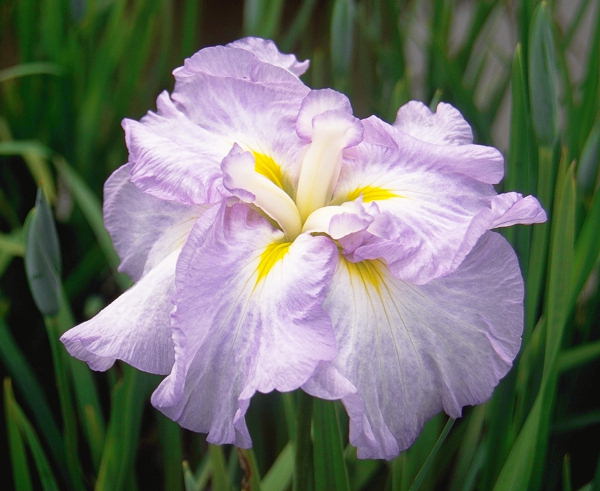霞の衣 かすみのころも KASUMI NO KOROMO 肥後系 中晩生 上品な薄い藤色の六英花。花径は18cmほどの大輪。 草丈は80cm程度。性質は丈夫で良く殖える。 熊本花菖蒲の「東雲」とよく似た色彩だが、こちらの方が大輪で、花菖蒲園の植栽にも 向く。こういった花弁があまり垂れず、大輪で、しかも繁殖の良い多花性の品種が、花菖 蒲園を彩るには一番良いような気がする。 1957年、平尾秀一氏作
