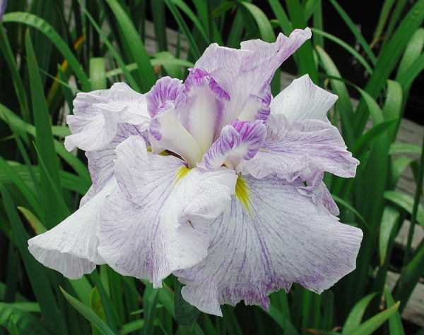霞の空 かすみのそら KASUMI NO SORA 肥後系 中生 白地に紫の砂子が少々入る六英から半八重咲き。花径はおよそ18cmの大輪。 草丈は60cm程度。「霞の雲」、「霞の虹」とは姉妹個体。 2002年、加茂花菖蒲園作