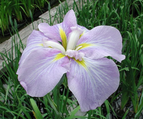 風の香り かぜのかおり KAZE NO KAORI 江戸系 中生 桃色を含む薄水色に白筋が淡くぼかす椀咲きの六英。花径はおよそ13cm程度。 草丈は120cmくらい。性質は丈夫で繁殖良い。長井古種と江戸系との交配。 2002年、加茂花菖蒲園作。