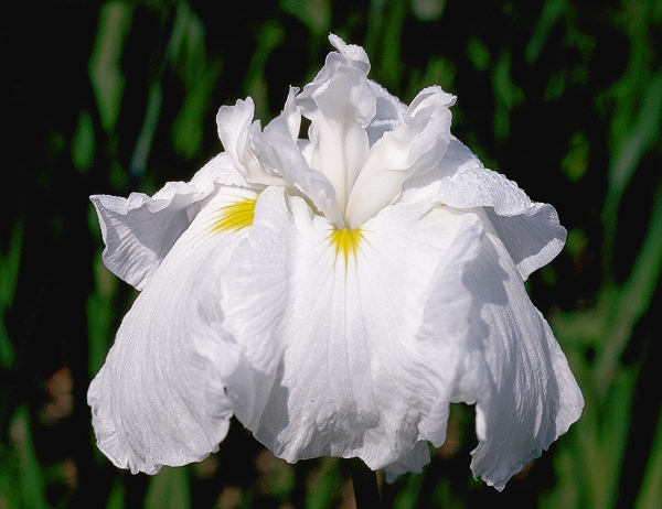肥後系 中生 雪白の六英花。花弁が伸びて深く垂れる往年の名花。花径はおよそ