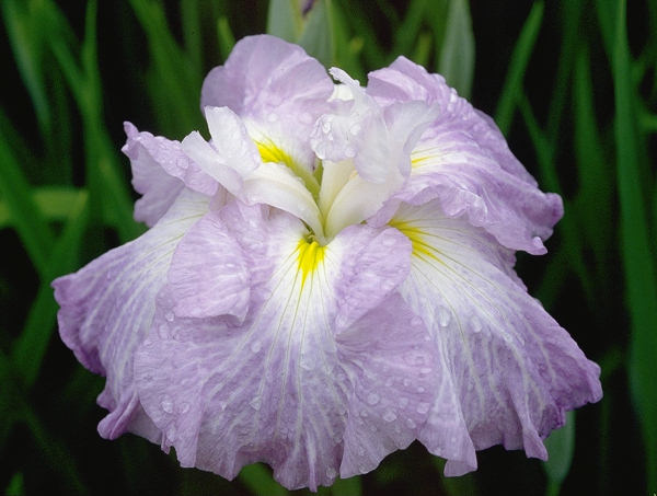 乾徳山 けんとくさん KENTOKU SAN 肥後系 薄い藤色に白筋の入る六英花。花径はおよそ18cm程度の大輪。 昭和40年代頃日本花菖蒲協会におられた中村元義氏の作。乾徳山とは山梨県 甲府市の北にある山の名で、中村氏が甲府にお住まいであったことからだと思われる。