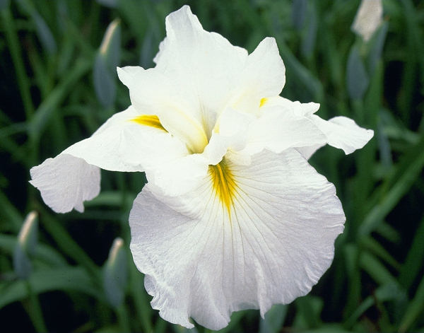 清 鶴 きよづる KIYOZURU 肥後系 中生 純白の三英花。花径は18cm程度の大輪。 草丈は60cm程度。性質、繁殖は普通。 平尾秀一氏が1980年に作出した品種。肥後系の純白三英花の最も代表的な品種。 花形がよく整い、気品高い。鉢作りにも花菖蒲園用にも向いている優良品種である。 当園で大量に生産し、全国の花菖蒲園に出荷してきた品種なので、こんにちでは、かなり 普及していると思われる。