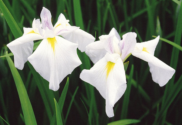 駒の残雪 こまのざんせつ KOMA NO ZANSETSU 江戸系 極早生 白地に鉾のみ紫の細い脈が入る単純な花容の三英花。 花径はおよそ10cmほどの小輪。草丈は50cm程度。性質はやや弱く、繁殖も少ない。 吉江清朗氏が1975年に作出した品種。細弁で小型で、性質、繁殖とも良くないので、 あまり普及もしていない。