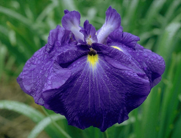 金剛城 こんごうじょう KONGO JHO 肥後系 中晩生 濃いコバルトがかるルリ紺の六英花。花径はおよそ18cm程度の大輪。 草丈は60cm程度。性質は強く、繁殖も良い。 平尾秀一氏が1970年に作出した品種。ルリ紺系では丈夫で花も良いので一般的な花となっており、 当園でも大量に生産し出荷してきたので、全国の花菖蒲園に普及していると思われる。